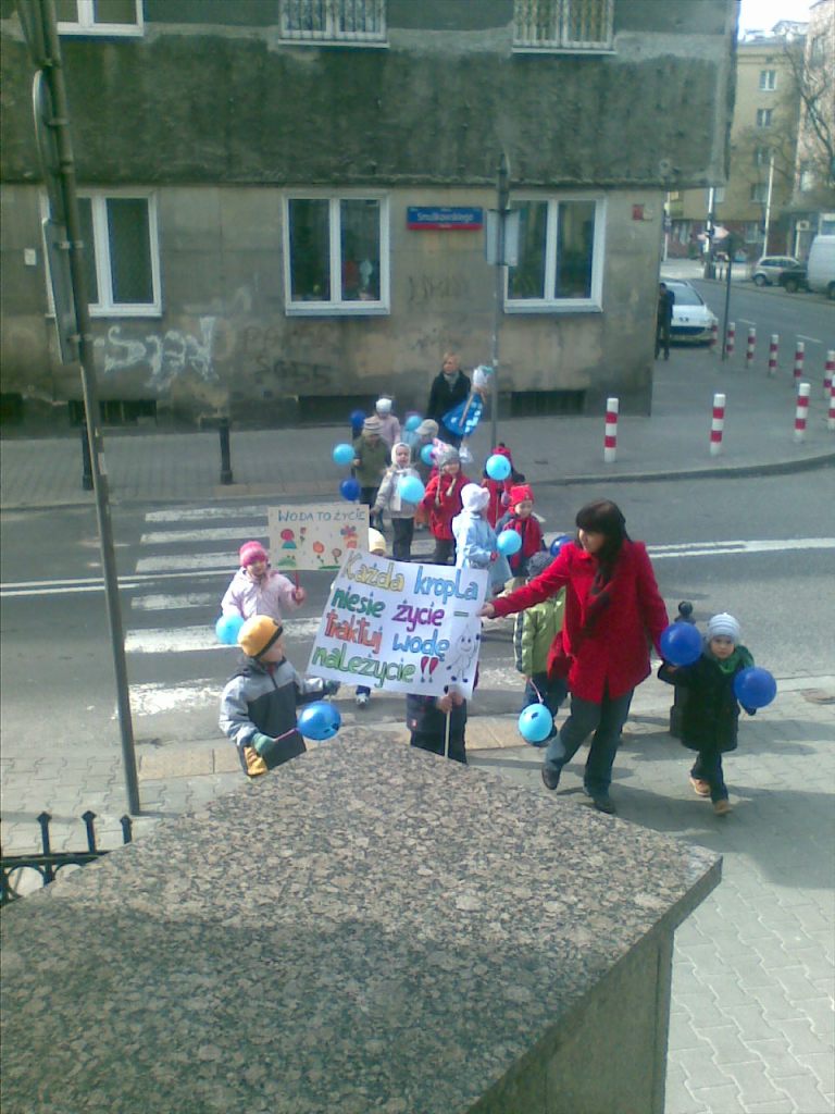 Każdy przedszkolaczek trzyma niebieski balonik a co kilka par przedszkolaczki trzymają transparenty, na których ktoś zupełnie nieprzedszkolaczkowymi rączkami wypisał szczytne hasła.