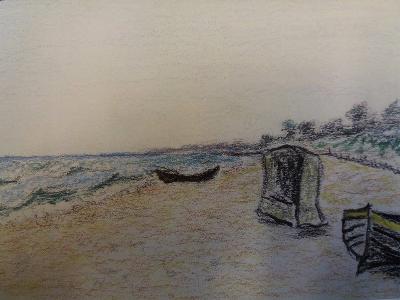 (Maria Dąbrowska, Kosz i łódki na plaży, 1959, (c) Muzeum Literatury w Warszawie)