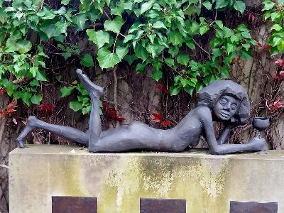 na przykład Marlenę Dietrich, bo to z jej powodu przychodzimy rano na cmentarz (wczoraj też tu byłem, ale nie sprawdziłem, gdzie są kwiaty i dopiero dzisiaj szukamy kwatery 34). Później pojawia się, ta co na zdjęciu, berlińska patronka dobrej śmierci. Naga macha nogami i popija wino, bardziej apetyczna niż patetyczna, chociaż A. twierdzi, że to przesada a ja że przecież radość życia (takiego jakim ono jest) jest warunkiem dobrej śmierci.