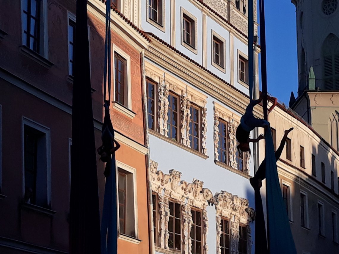 Ich geometria na tle kamienic i wieży.