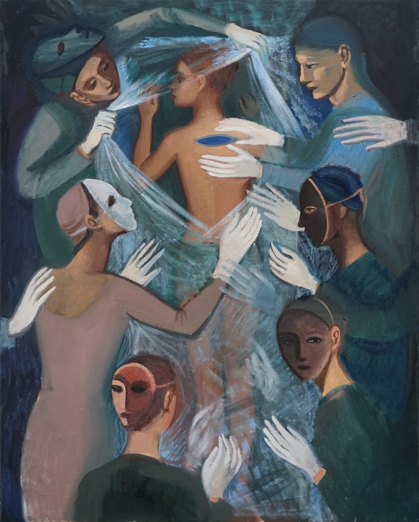 Na obrazach Karpowicz kolejne zabiegi medyczne zamieniają się w obrzędy. Rytuał jawi się więc jako sposób oswajania choroby. Całkiem niedawno zapisywałem o bohaterach „Tality”: ich rytuał, jak każdy z rytuałów (…) ożywia mit. U Karpowicz w rytuale uczestniczą chora i medycy. Postaci lekarzy i pielęgniarek przypominają hieratyczne figury bóstw. Ów stojący u nóg z maską byka w „Pięknej operacji”, czyż nie jest Apisem? Zarówno ręce, jak i maski, przywołują obrazy ze ścian sarkofagów Egiptu.