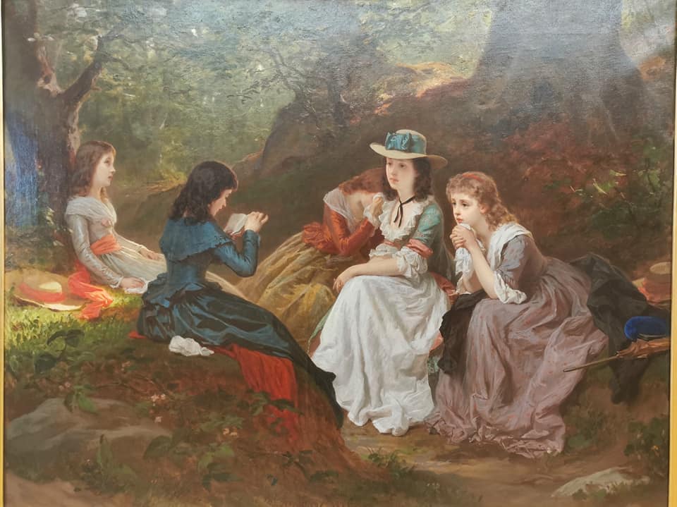 (A może było zupełnie inaczej? Pan Hofrat zaprosił miejscowego malarza od modnych scen romantycznych, aby na obrazie sportretował jego córki wraz z przyjaciółkami. Scenkę rodzajową zaaranżowano w pobliskim parku angielskim, po pozowaniu wszyscy udali się do pałacu na leguminę, dziewczynkom podano poncz, a dorosłym – wino).