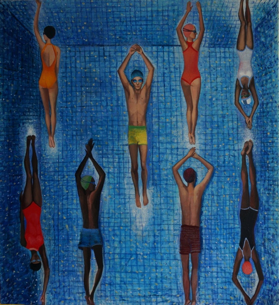Boję się wody. Dziecko też boi się wody. W tej czystej modernistycznej architekturze – wieże, bulaje, szpitalna biel płytek – strach jest jeszcze większy. Patrzę z trybun jak płyną, jak w obrazach ulubionej malarki Ka. Jak chyboczą, jak głęboko.