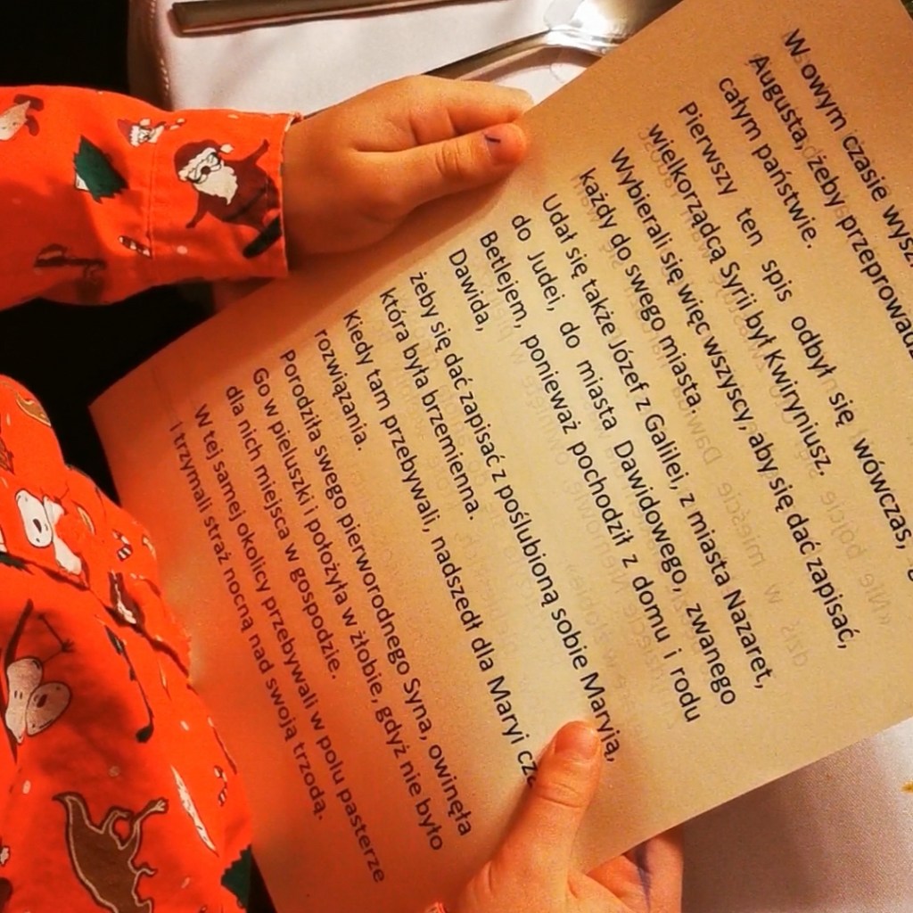 Ten pokój w jasnym świetle. Dziecko po raz pierwszy czyta na głos o wielkorządcy Kwiryniuszu. M. milczy, braknie jej już słów. Barszcz ma kolor jasny: domyślają się winy jabłka. Tylko grzyby smakują tak jak dawno temu. Przełamujemy się aniołem i świętą rodziną. W szarawej mgle Lublin czeka na pasterkę.