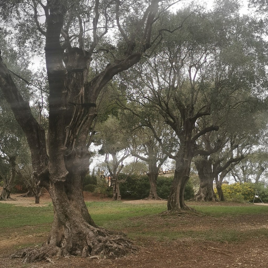 Ten sam widok, drzewa oliwne obwieszone pękatymi owocami. Trwałość tła. Wzruszająca kora.
