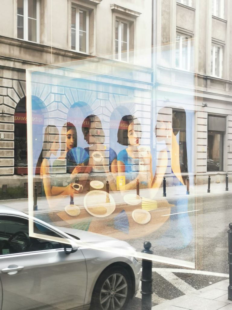 Stało się tradycją, że na wystawy ulubionej malarki Ka. zjawiamy się w ostatniej chwili (Zamość), najlepiej, kiedy pogoda pod psem (Płock) a galeria pozostaje zamknięta (dzisiaj, Warszawa). Moment był więc platoński: oglądałem nie sztukę, ale jej odbicie w szybach i widoku miasta.
