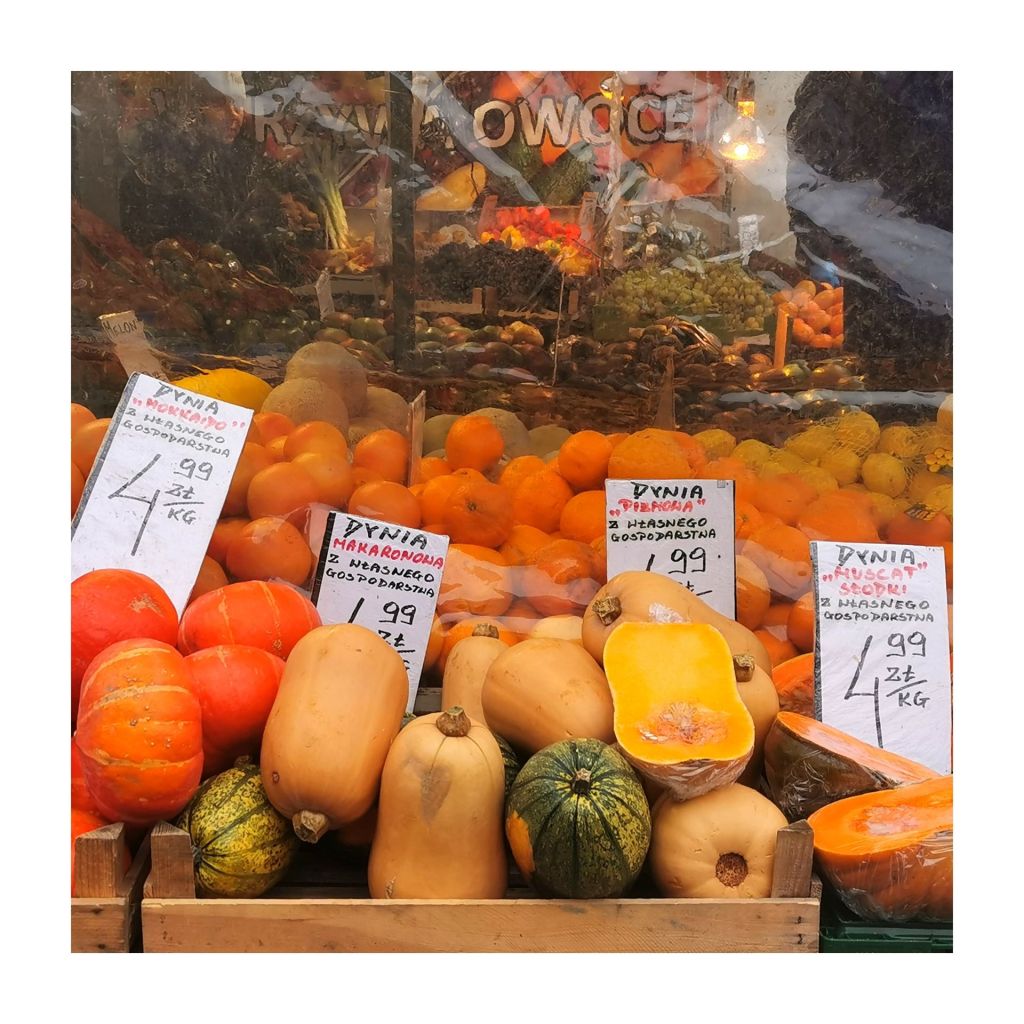 Na hali z J. Mówię, czytanie B. powolne. Susz już. Jeszcze dynie ostatnie. Grzybki pan zachęca. Mewy krążą. Kwiaciarzy zdjęli. Łyso tak przed halą. Chyba wrócą, bo jak to. Śpiewa samotnie Peruwiańczyk.